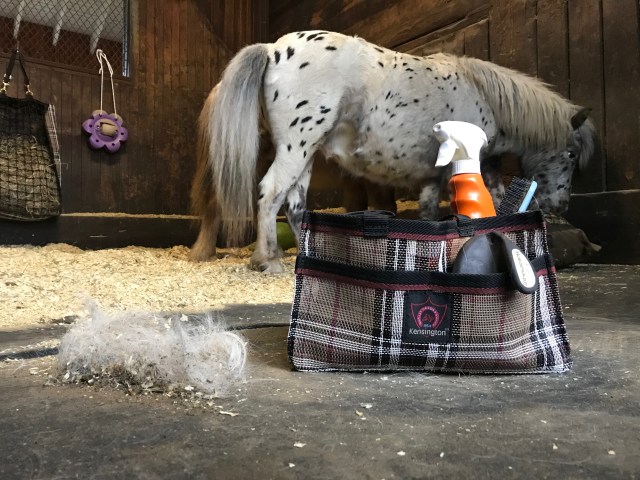 This adorable small grooming tote is by Kensington Products. I purchased it a few years ago from Dover Saddlery to match the Kensington luggage bag I have. Honestly it sat in my box for a while, just holding extra brushes, until the other day when I was tired of unsuccessfully trying to carry things back and forth from the grooming stall to Jasper and Wallace’s stall. A light bulb went off when I remembered I had this perfect sized travel tote to throw my stuff into! Its small enough to store just about anywhere, but big enough to hold my quick go-to products! Now I use it almost every day, and it will definitely be coming with me to future shows!